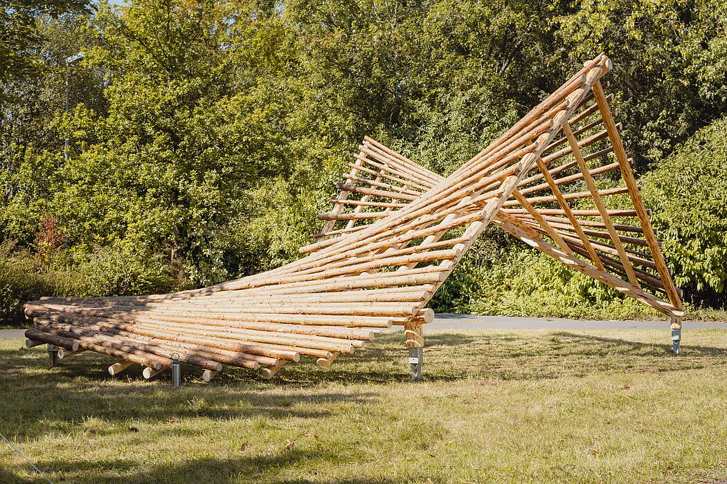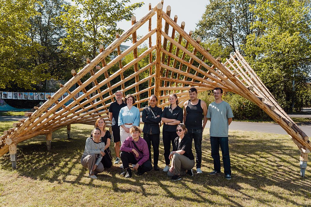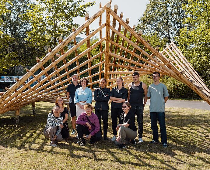 Im vergangenen Sommersemester wurden im Rahmen eines Masterseminars Entwürfe aus Schwachholz erstellt. Im nun zu Ende gehenden Intensivworkshop (16. – 22. September) wurde einer dieser Entwürfe im Maßstab 1:1 realisiert. Die Studierenden und wissenschaftlichen Mitarbeiter:innen haben zu diesem Zweck das verwendete Holz in der Region Gräfinau-Angstedt geerntet mit Unterstützung des Kompetenzzentrums HRN der Fachhochschule Erfurt und des Bündnisses Holz-21-regio.