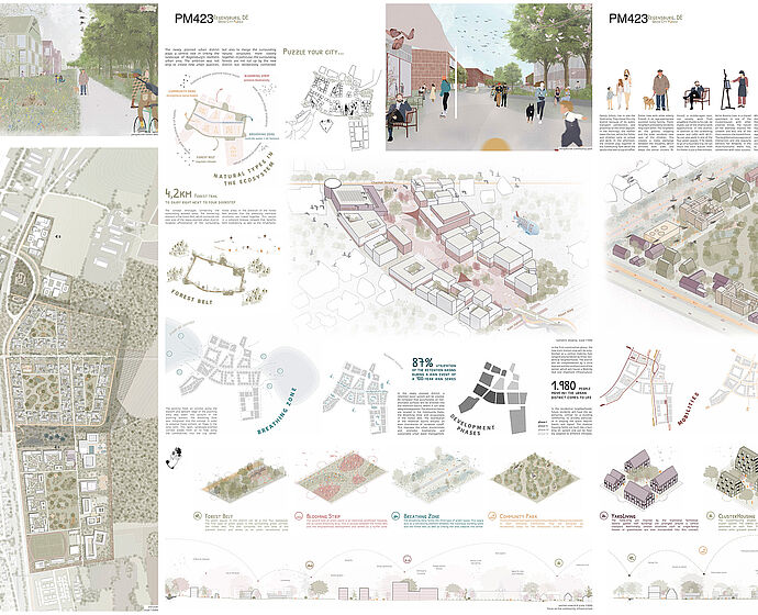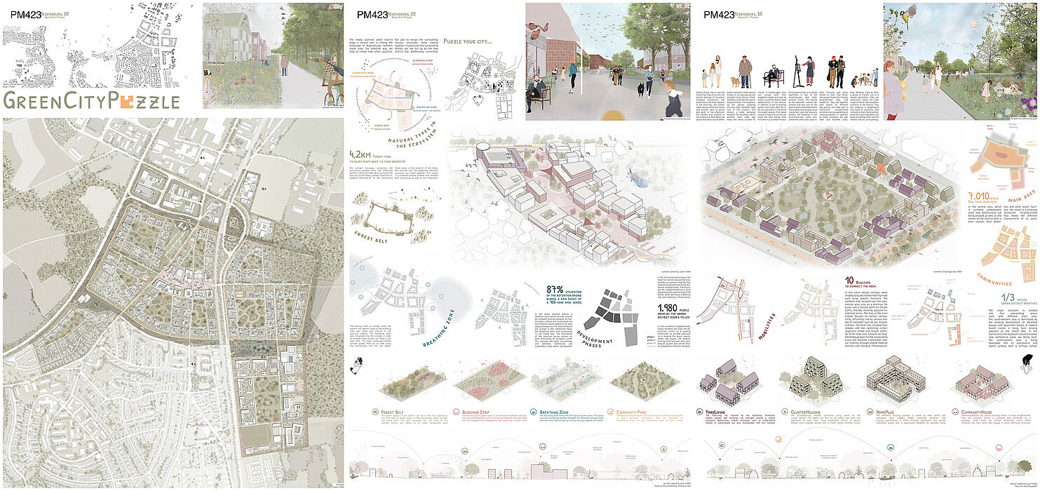 Auszüge aus der Jury Bewertung: The proposal ‘zam wachsn’ explores the implementation of the future new district beyond the notion of living together, exploring the idea of ‘growing together’, which, translated into the Bavarian dialect, is the title given to the project: ‘zam wachsn’. (…) The project is based on a careful analysis of the existing environment from the territorial scale to the scale of proximity, interweaving scales by means of the central new ecocorridor which crosses the area from west to east. (…) The jury highlighted the morphological adaptation to the very different existing urban contexts. The district is organized into six different neighbourhoods based on a wide range of courtyard typologies that accommodate various uses and ways of living. (…) Each of these centralities is highlighted by a small and slim tower as an echo of historical towers in Regensburg. (…) The jury valued very positively the adaptation of the project to the built and non-built pre-existing elements, the organization of the new district along the central eco-corridor as a resource-oriented urbanism, and the proposed implementation process, which seems flexible and feasible at the same time. The project „GreenCityPuzzle“ impresses with its innovative approach in line with the Europan theme of ‘Re-Sourcing’ and the specific context of northern Regensburg between Wutzlhofen and Haslbach. The independent urban design features eight unusually large, porous block edges. These are not closed city blocks, but open structures that combine to form large-scale squares. At the heart of the design are the spacious green inner areas, around which loosely grouped building structures are arranged. (…) The jury rated the east-west oriented neighbourhood centre very positively, as it is well connected to transport and clearly bundles public functions such as schools and supply facilities in the centre. (…)
