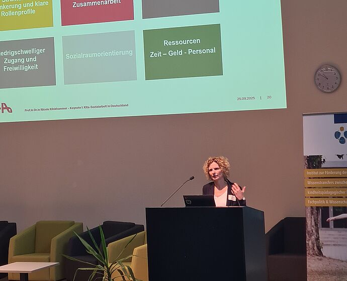 In ihrem Fachvortrag gab Prof. Dr. Nicole Klinkhammer von der BAG-BEK und der Technischen Hochschule Augsburg Einblicke in ein vielgestaltiges Handlungsfeld. Unterschiedliche Konzepte und Modelle in den Bundesländern reichten von einer fest installierten Kita-Sozialarbeit bis hin zu eher sporadischer Sozialer Arbeit in einer Kita. Eine Kita-Sozialarbeit könne dann gelingen, wenn die Rollen klar seien, sie strukturell verankert sei, verschiedene Professionen zusammenarbeiteten, die Fachkräfte qualifiziert seien und es einen niedrigschwelligen Zugang zu den Angeboten und Dienste gäbe. Vor allem aber gehe es um ausreichende Ressourcen von Zeit, Geld und Personal.