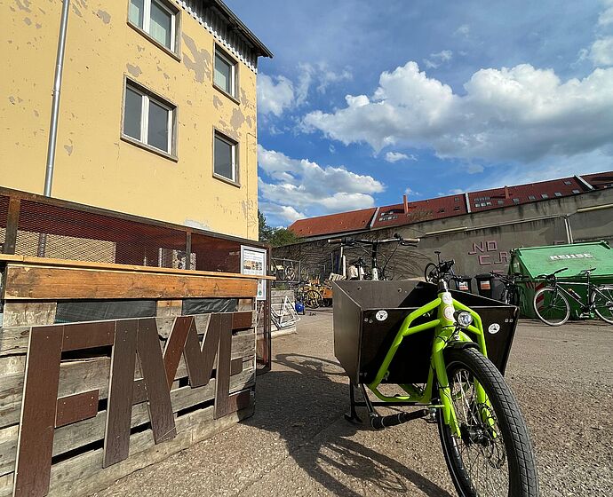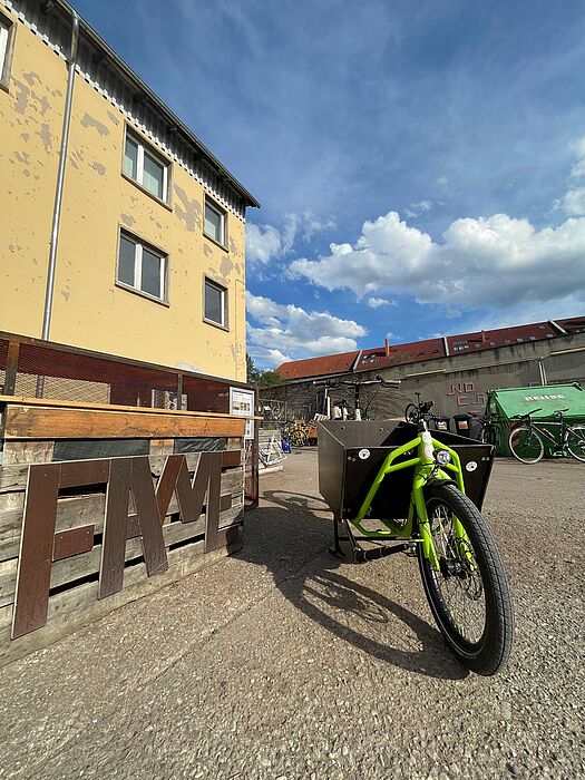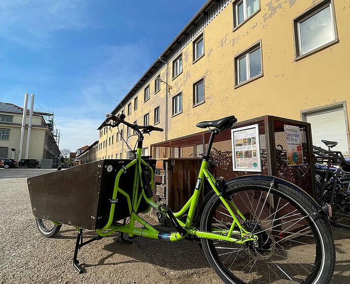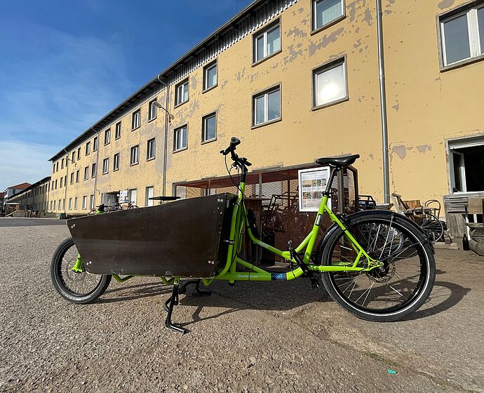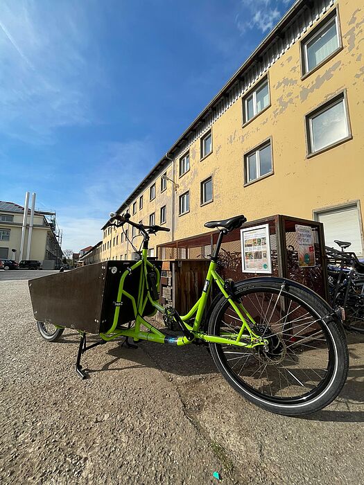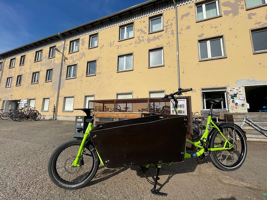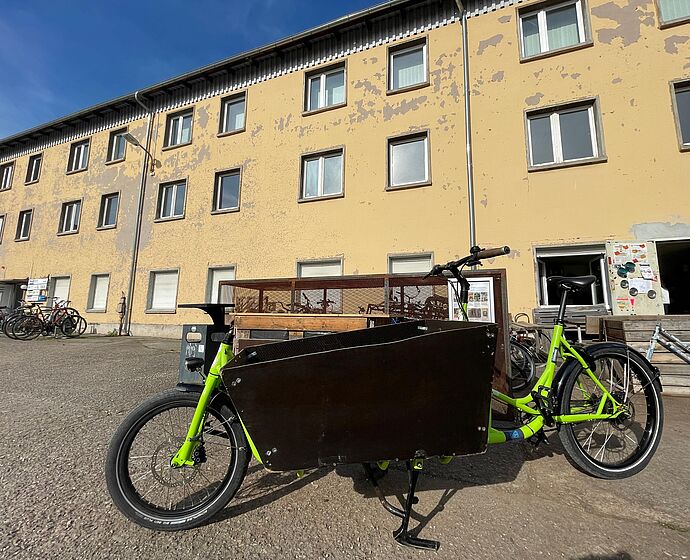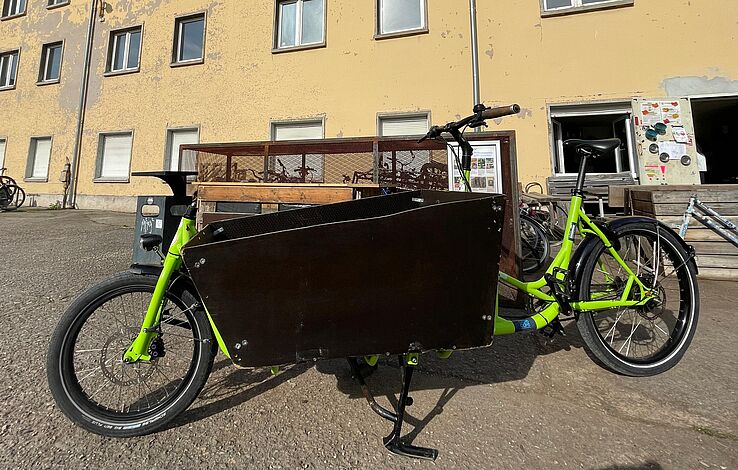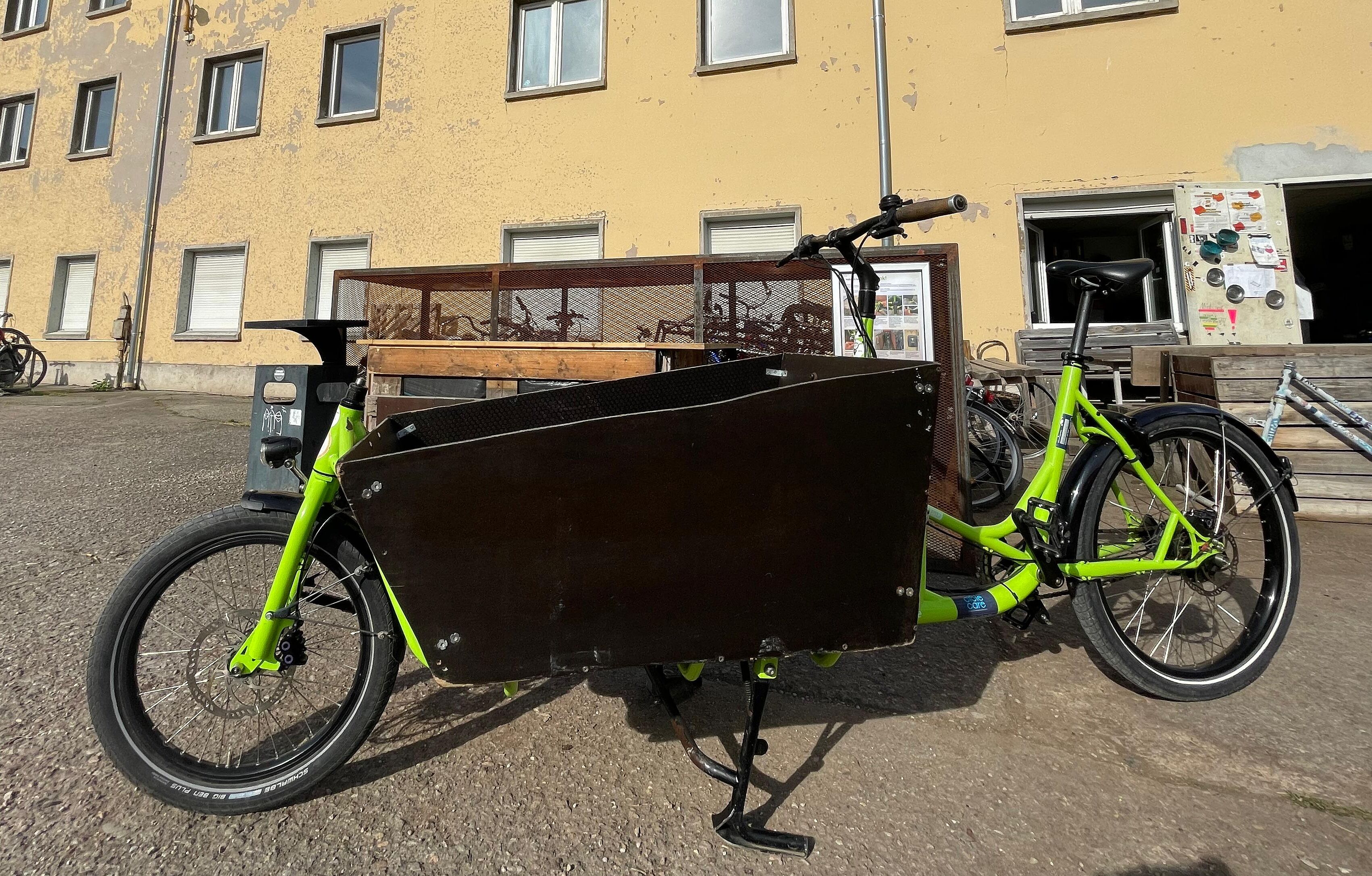 Ein Lastenrad von ella auszuleihen ist ganz einfach, zum Beispiel den Grünflink an der FHE: